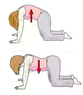 跪在地板上,雙手撐地,頸部平行於地面;通過收緊腹部及臀部的肌肉,拱起背部,稍稍低頭;保持5秒鐘;雙手伸直,讓拱起的背部向地板方向運動。記住將身體的重量均勻地分配到雙手和雙腿上;保持姿勢5秒鐘;重複5次。