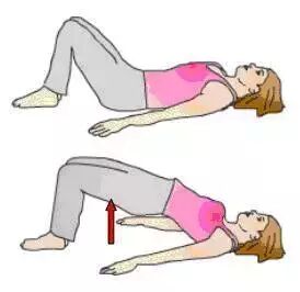 仰臥,雙膝屈曲,雙足稍分開,同肩寬,足底貼地,雙手置於身體兩側;一點點抬高髖部,不要拱起背。注意不要讓你的腹部凸出來,這樣可以避免拱背。保持肩和膝處於同一直線;保持5秒鐘;緩慢放低髖部,復原;重複5次。