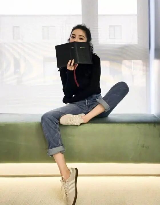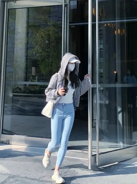 黑色緊身上衣搭配藍色牛仔褲,再搭配米白色運動鞋,整體穿搭顯得很有活力。加上紮起來的髮型,更加的乾淨利落。