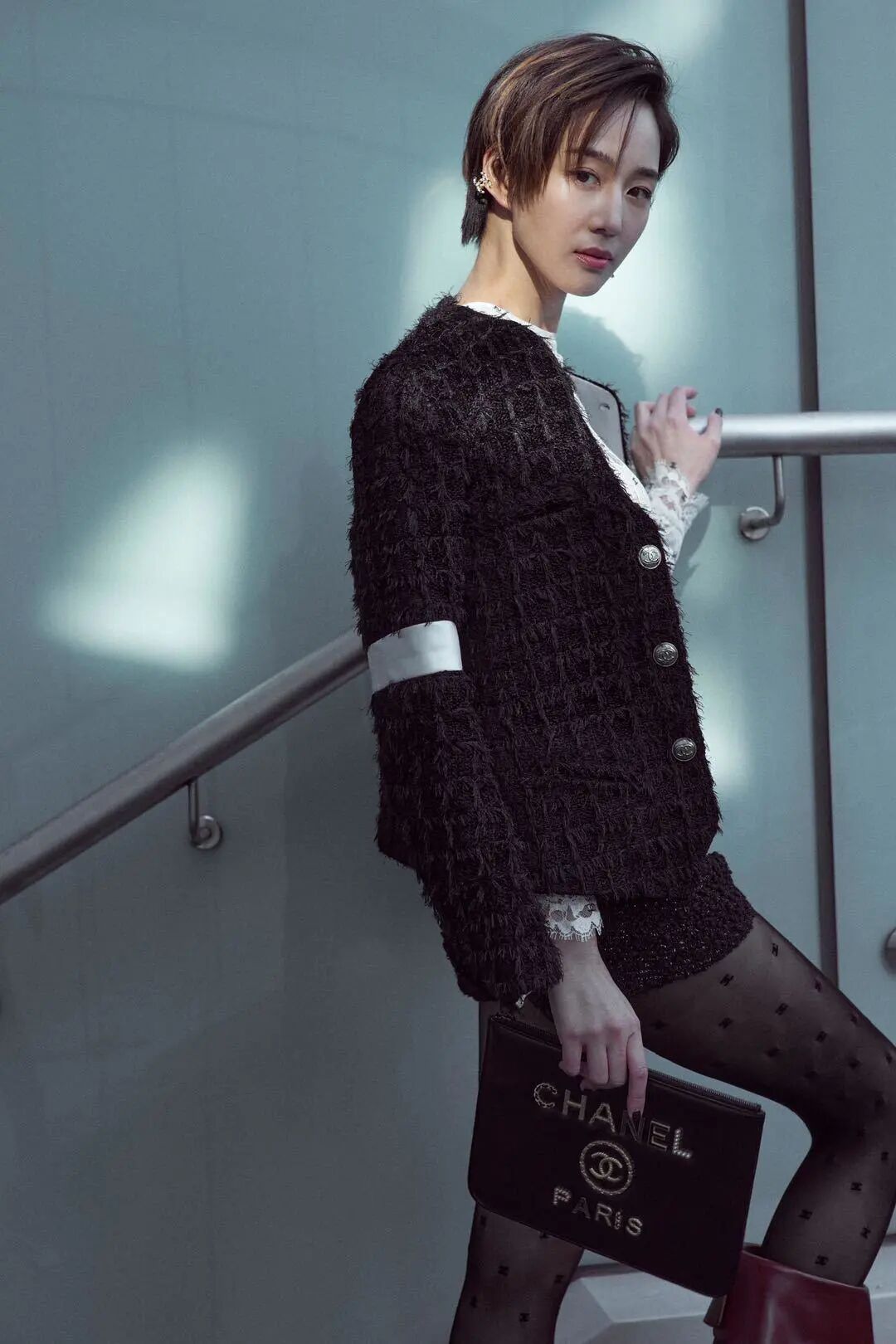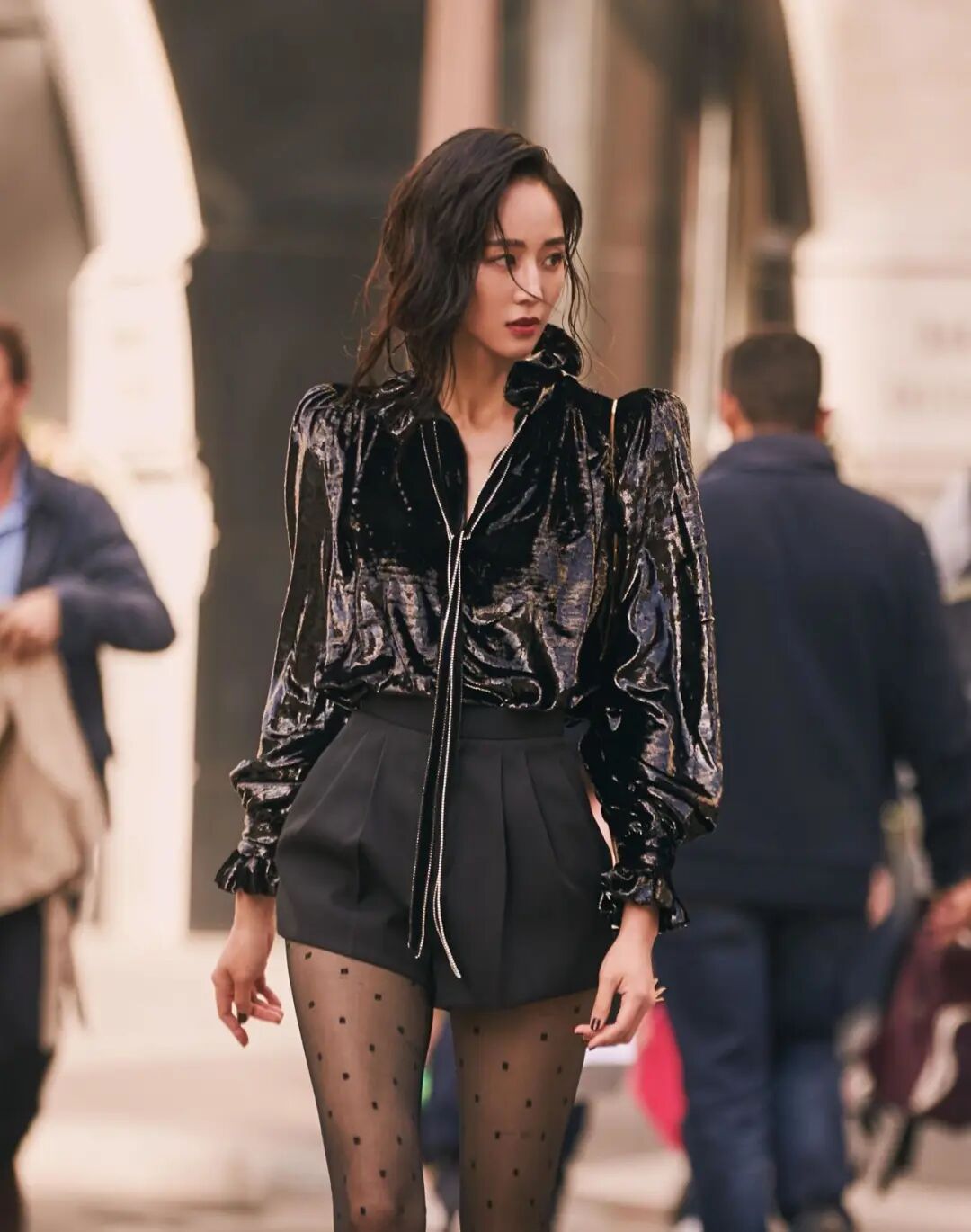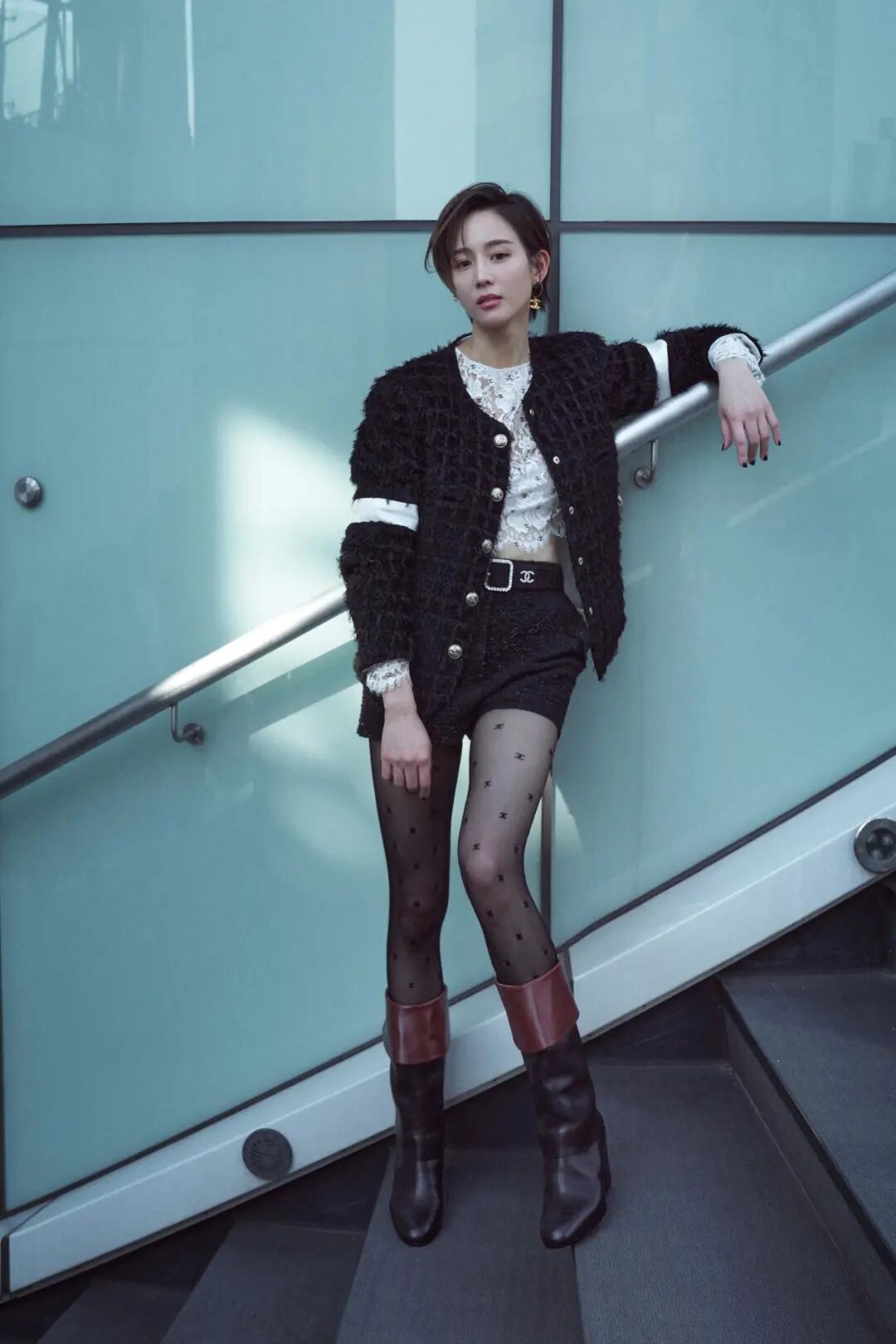 黑色的百褶短裙,又很小巧精緻,高級質感的皮衣搭配小巧的短裙,再配一雙黑色印花絲襪,這一身不要太性感,太高級。張鈞蜜的頭髮,是做了一個凌亂的造型,看起來有一種野性美,很個性很隨意。這一身在加上張鈞蜜本來就大氣的五官,看起來很酷很高級。
