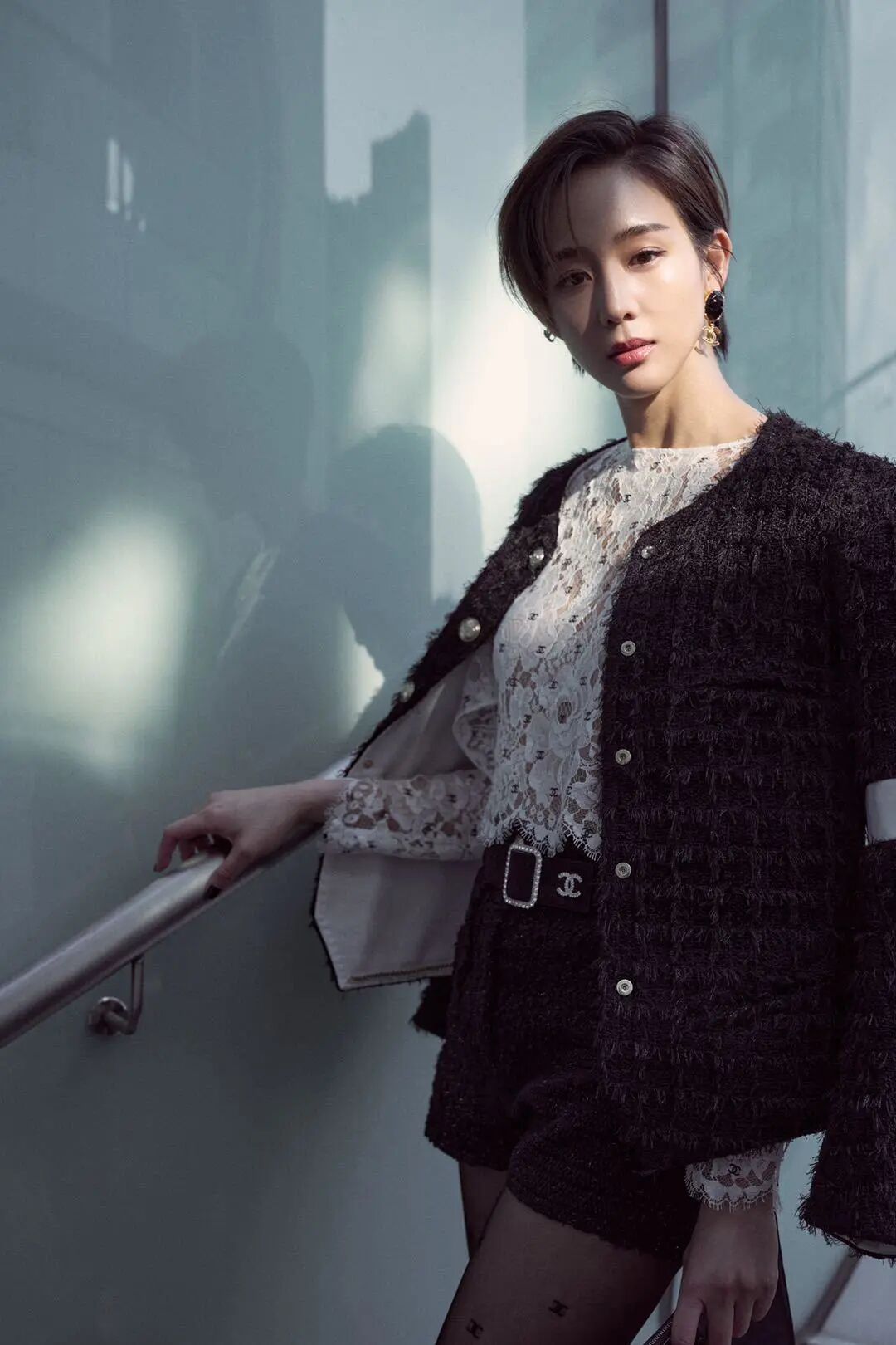 春天應該套一件薄厚適中的外套,有很好的保暖作用,同時也是十分好看。張鈞蜜穿的這件外套薄厚就很適中,而且顏色選擇是深色,也倒很符合春天的特點,春風涼涼又夾冷。穿一件深色的外套,裡面搭一件白色的鏤空的蕾絲的內襯,看起來不要太高級了。張鈞蜜剪了短髮,也是很大膽,不過話說回來,短髮這種髮型,對臉型也是有很高要求的,一般臉小的女生駕馭起來就沒有毛病,相反臉型太大的女生,留短髮會給人一種男孩子的感覺。