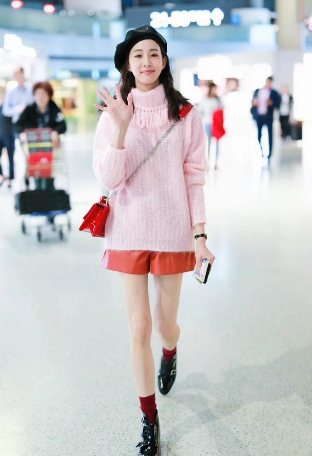 酷帥的張鈞蜜也有甜美可人的一面哦,果然粉色的柔和感,任誰穿上都會顯得很甜美,尤其是張鈞蜜這種顏值身材在線的美女,更是不用說。粉色的高領毛衣+紅色短皮褲搭配黑色馬丁靴,穿一雙酒紅色的中筒襪,這也太好看了。再背一個很小巧的精緻的紅色包包,帶上女孩都喜歡的貝雷帽,也不要太溫柔可人。張鈞蜜因為自己本身五官就十分大氣,這也決定了她可以駕馭很多風格,無論是酷帥還是甜美。顏值在線,怎麼樣都好看。