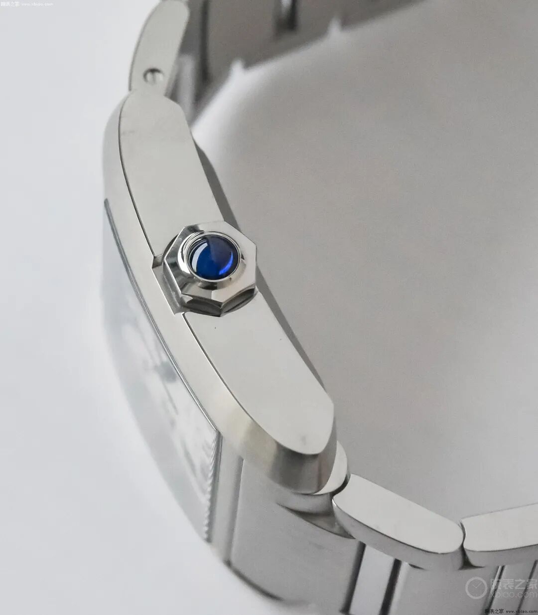 咱們今天主要看男表。在卡地亞的尺寸中,大號和加大號,是男表。大號一般對應36、37毫米;加大號對應40毫米以上。新一代法國坦克的男款,只有鋼殼版本,並且也只有男款是機械機芯。法國坦克男款,它是採用的大三針,有日曆設計(在這裡說一個小知識:卡地亞的石英錶,都是兩針表)。指針都進行了烤藍,在盤面中央,有方形刻度內圈。八角形錶冠上,有卡地亞標誌性的藍色尖晶石,識別度非常高。這款男表的厚度是10.1毫米,也是比較薄的,正裝休閒通吃。