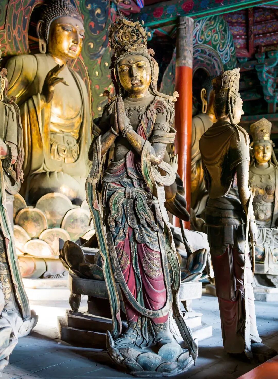 遼金時期所發展的減柱法,讓善化寺有更大的室內空間,顯得古韻更濃。初看古樸無華,進入寺門才會看到,兩側四尊巨大的天王彩塑赫然佇立,外表並不突出的善化寺,竟蘊含著如此精美內涵。