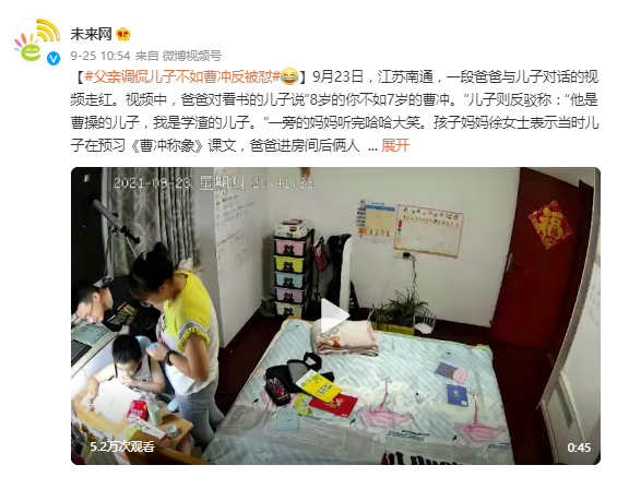 視頻中爸爸正在輔導兒子,說道曹衝稱象的時候只有8歲,你現在也正好8歲,要像曹衝學習。被兒子立馬糾正“曹衝7歲”。