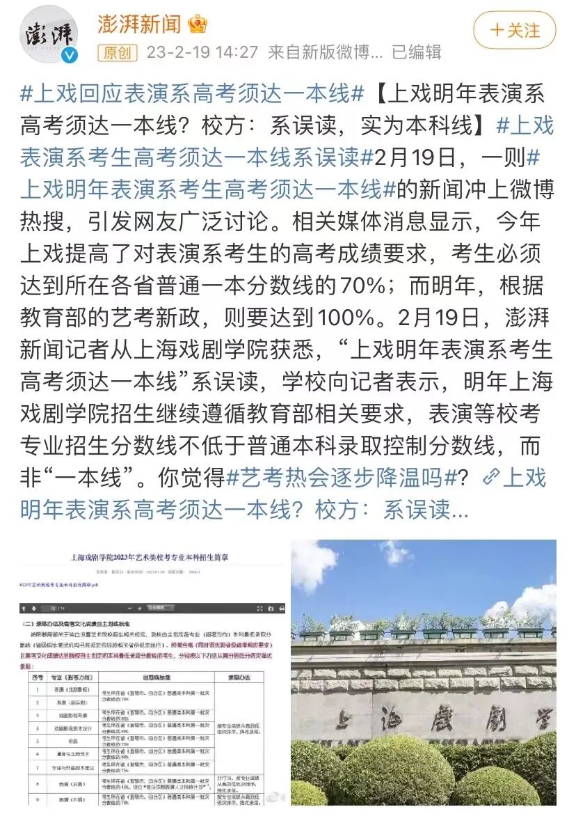今天,根據#上戲回應表演系高考須達一本線#的消息,媒體求證了校方,校方回應將續遵循教育部相關要求,表演等校考專業招生分數線不低於普通本科錄取控制分數線,而非“一本線”。