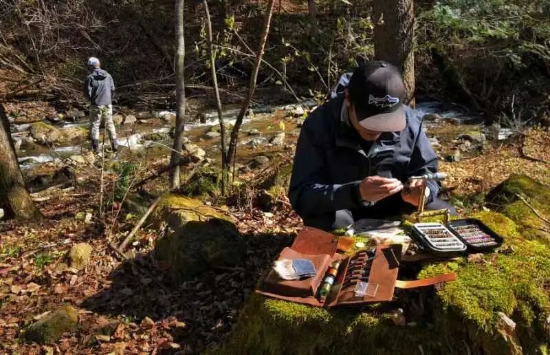 “大概 8、9 年前在北京延慶玉渡山,那裡的溪流環境非常美,潺潺溪流,水非常淺。魚在吃水面羽化的蜉蝣,像一個個小帆船一樣。我幾乎用盡了餌盒裡所有的餌,這些餌大多是仿照國外視頻綁制的。水面漂著真蟲子和我的餌,它幾乎圍著魚餌把真蟲子吃了一圈,也沒咬鉤。最後我乾脆撈了一隻小蜉蝣來仔細觀察,它們的大小、顏色有很大區別,同時意識到真蟲和假餌在水面狀態差別非常大,因為魚是從水下往上看的,它們很在意昆蟲的軀體、腿、尾巴和翅膀輪廓。於是回家立刻把實地採集來的信息通過綁制呈現出來,第二天又去嘗試。果然它咬鉤了,魚嘴撞開水面把餌咬住的一瞬間,我感覺周圍的一切幾乎都停止了。這是我印象深刻的一次釣魚經歷,同時也讓我明白了“觀察”在飛釣過程中的重要意義。