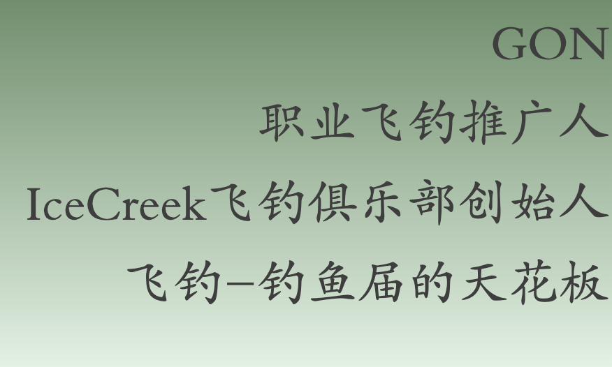 GON 從小就喜歡釣魚,上大學的時候喜歡路亞、磯釣。當時從一本釣魚裝備雜誌上看到了飛釣,買了第一套裝備,但越看越不對,當時又很少人玩,資料也欠缺,就這樣線裝反著玩了一年左右就放棄了。直到後來工作後,在國外看到專業人士的飛釣,動作實在太優雅了,於是又重新拾起了興趣。