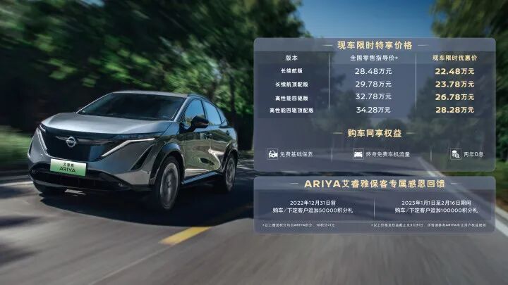 由特斯拉率先挑起的電車價格戰仍在蔓延中。上週末,一張降價海報在汽車圈廣為流傳。海報顯示,東風日產純電SUV艾睿雅開啟限時優惠,最低只要22.48萬元起。對比去年9月上市時公佈的官方售價區間27.28萬-34.28萬元,艾睿雅此次降價全系車型售價下調了6萬元。