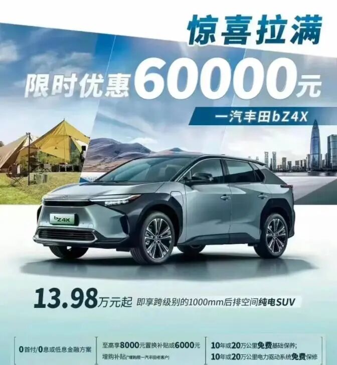 2月9日,廣汽豐田宣佈旗下純電SUV bZ4X降價3萬元。一週後,網上傳出一汽豐田bZ4X降價6萬元的消息,原起售價為19.98萬元,降價後為13.98萬元起。