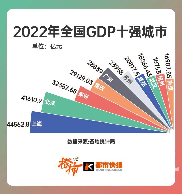 翻開2022年全國城市經濟成績單,GDP十強城市分別為:上海、北京、深圳、重慶、廣州、蘇州、成都、武漢、杭州和南京。其中,前七位是“2萬億城市”。
