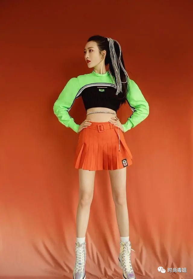 再看到這身造型,上身的亮綠色再搭配下身的亮橘色,兩種具有強烈視覺效果的顏色搭配在一起形成一種絕美的視覺撞擊效果,十足的女團氣息。像這種風格的造型一般比較適合舞臺,日常的話會顯得較為誇張。如果把服裝顏色換成淡色的話,比如淡紫色或者是淡粉色也是相當有看點的哦!