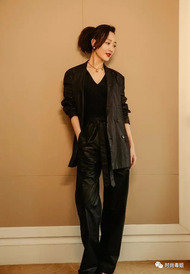 純黑色的服裝造型看上去就顯得相對成熟一些,比如王鷗這身穿搭,顯得中性幹練。而鞋子的搭配也是較為難,比如比較氣質的尖頭單鞋或者是高跟鞋都可以,露趾的涼鞋則不太建議。