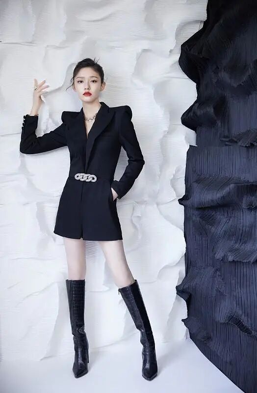 裙裝上半身採用西裝的經典設計,基礎的墊肩加上襯衫領,打造出西裝的幹練正式氣息,同樣通過下襬延長的設計,來打造出裙裝的效果,在腰間用黑色的幾何配飾進行裝飾,增加時尚氣息,搭配上黑色高跟長靴,更顯女性魅力。