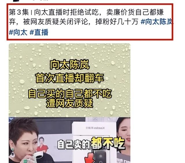 當然,倘若立人設,也得注意不要翻車,前段時間富婆向太深入民間直播給家人送福利,結果當著鏡頭拿腔拿調看什麼都嫌棄、哪個都不願試,最終被好一頓噴。