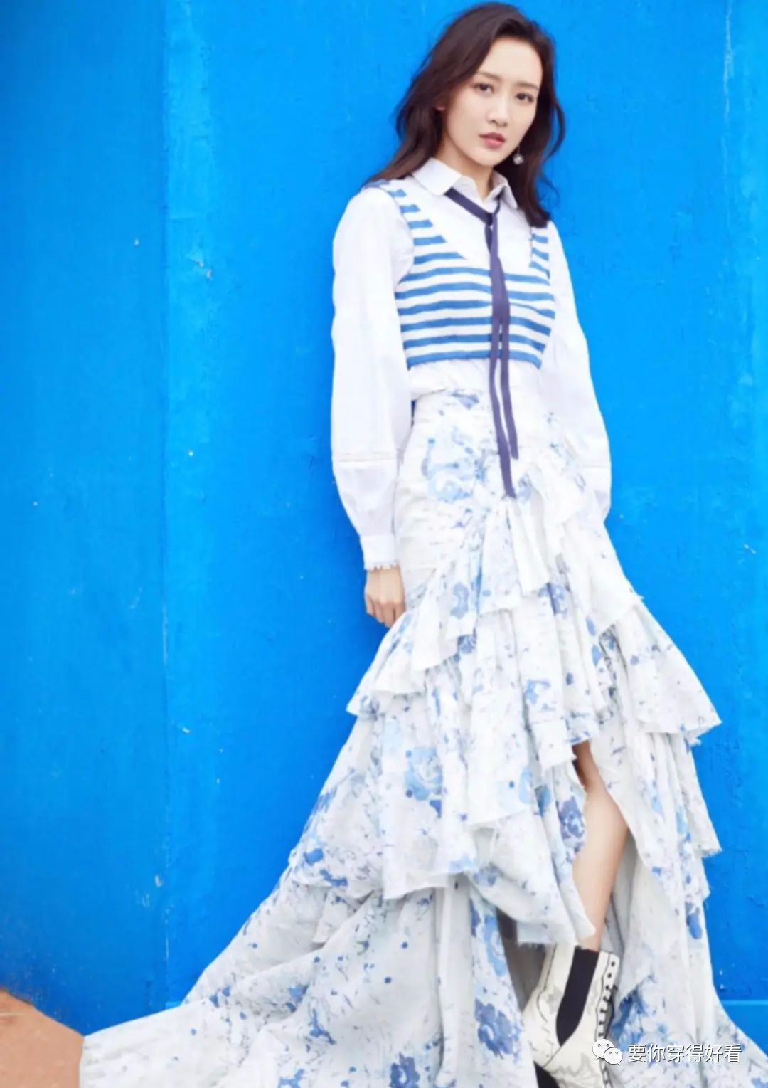 最近特別流行一種內衣外穿的設計,王鷗的這件連衣裙就很有創意感,上身是一個白色的襯衫,袖子做的略為寬鬆,與下裙的波浪不規則剪裁設計相互照應。