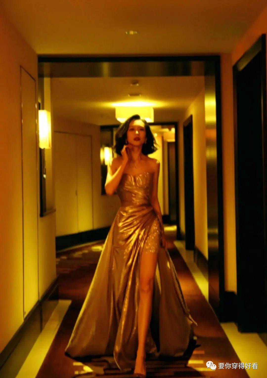 王鷗近日的港風造型,一回眸是百媚生啊,短款捲髮的設計更加偏向成熟感,顯得年紀有點老,但也幸虧有著禮裙的襯托,更加有著霸氣的美感!金色的連衣裙在燈光的照耀下,更加美麗,裙襬下是一個開叉的設計,更加有利於行走,但同時在行走時將大長腿展露在外,淺口的金色高跟鞋更加襯托出這一雙大長腿的魅力!