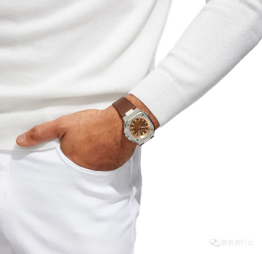 今年BR 05 Skeleton再添新妝,換上金色錶盤的BR 05 Skeleton Golden滿溢都市時尚氣質,在休閒動感風格基礎上更具全新的華貴色彩個性,出眾製表工藝與設計時尚完美融和。