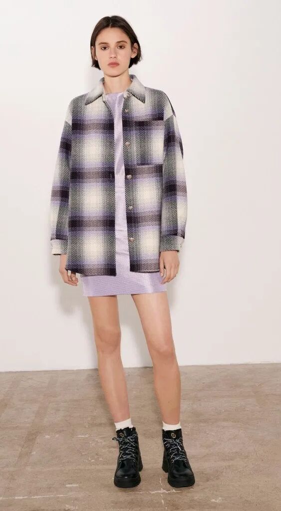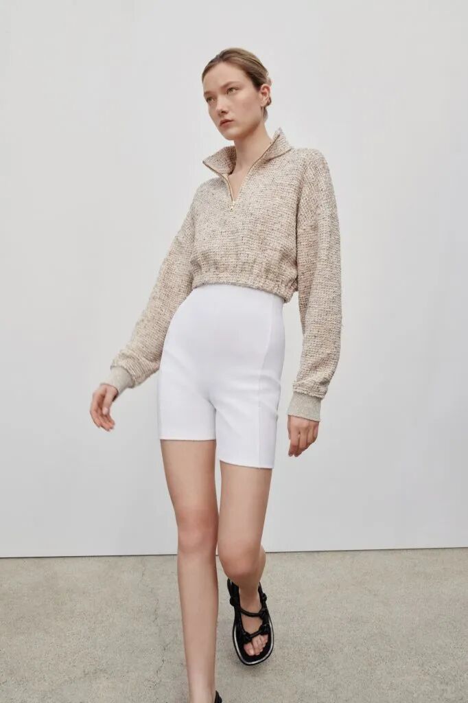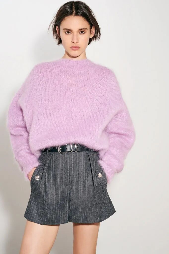 中性的西裝短褲,遇上溫柔的軟軟糯糯淺紫色毛衣,構建出一個年輕、時髦而輕鬆的都市女性形象。