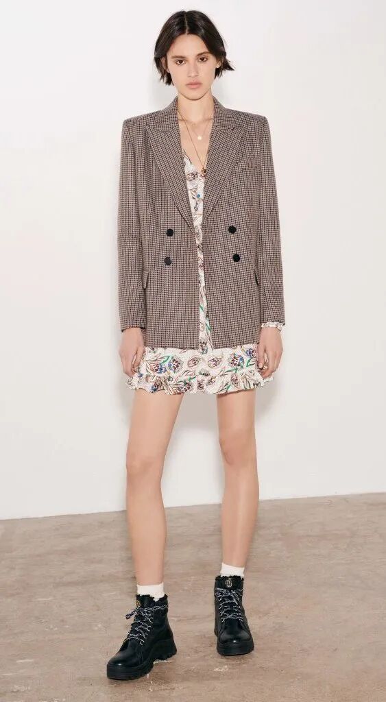 短款連衣裙+外套的搭配中,連衣裙儘量要選擇簡單的色彩和款式,太過花裡胡哨的樣式會讓穿搭顯得累贅沉重。如果你更喜歡碎花短裙,淺色系的碎花會更清新、更好搭配。外套則以蓋過臀部的長度為最佳,若隱若現的裙邊,會顯得腿更長,比例更好。