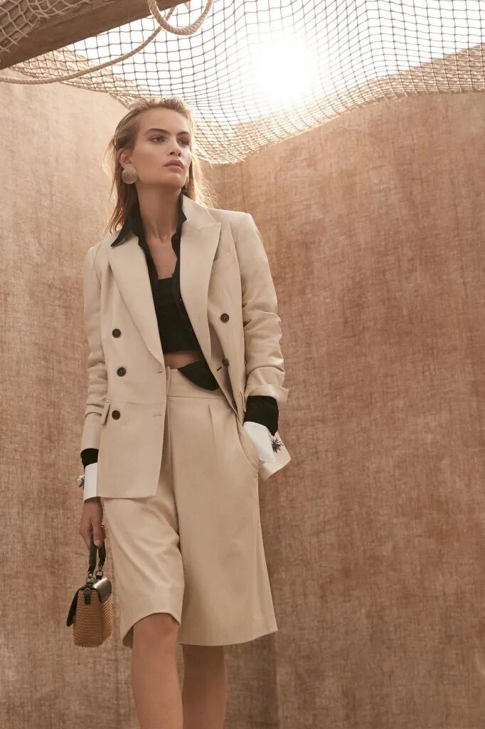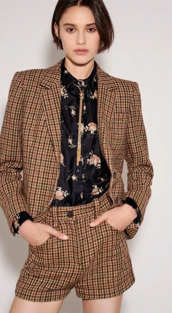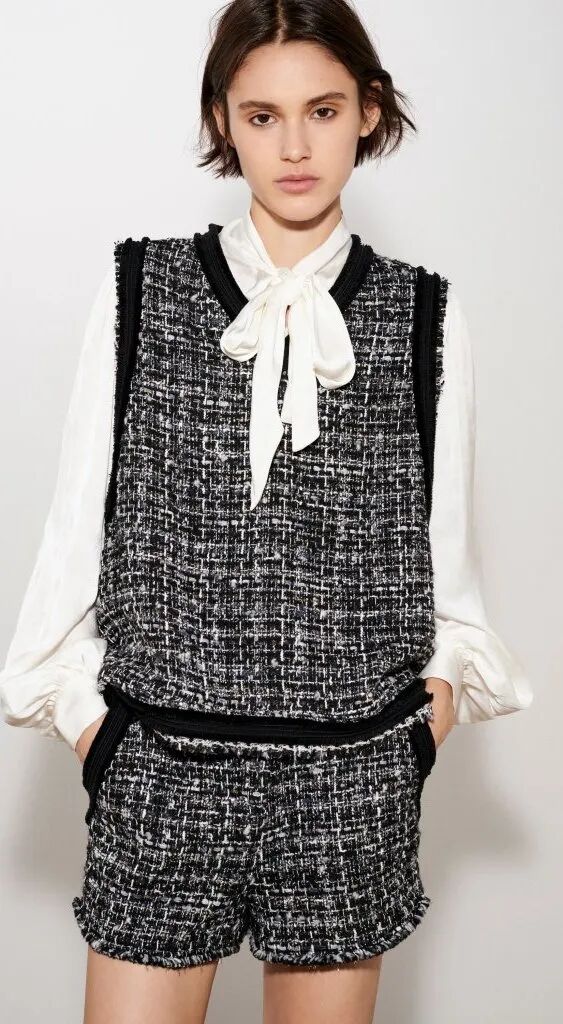 清爽的短褲搭配長袖上衣,西裝、夾克、皮衣、襯衫背心……細節上,設計師運用了大地色千鳥格紋、小香風粗花呢、亮鑽、皮質等復古元素,既幹練又時髦。