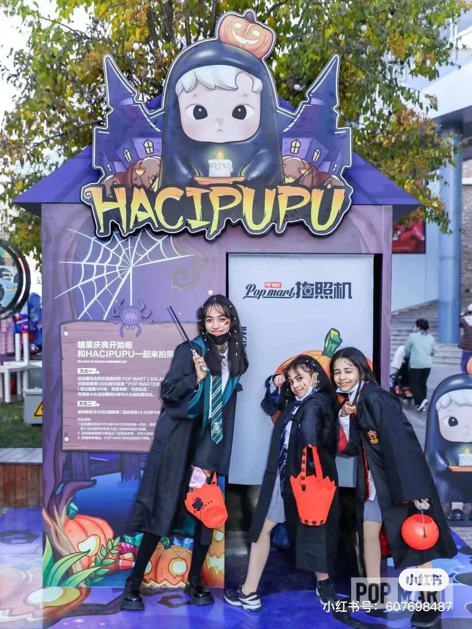 這已經不是泡泡瑪特第一次玩大頭貼裝置了,之前萬聖節的時候也在藍色港灣辦了一場“糖果大派對”,玩趣時刻和HACIPUPU一起拍照,POP MART你是真的很懂女生喜歡什麼。