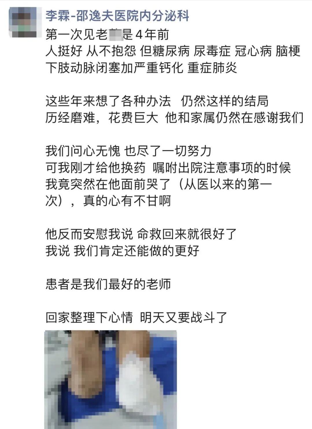 我們問心無愧,也盡了一切努力。可我剛才給他換藥,囑咐出院注意事項的時候,我竟然在他面前哭了(從醫以來的第一次),真的心有不甘啊。