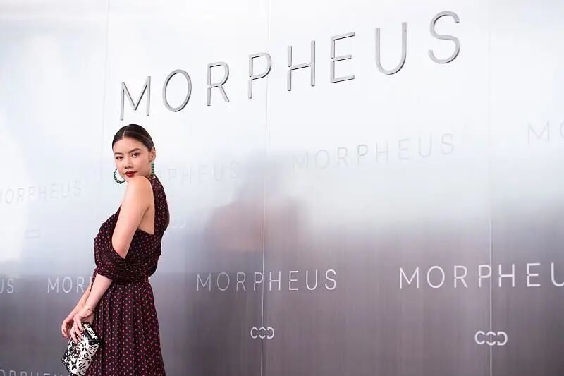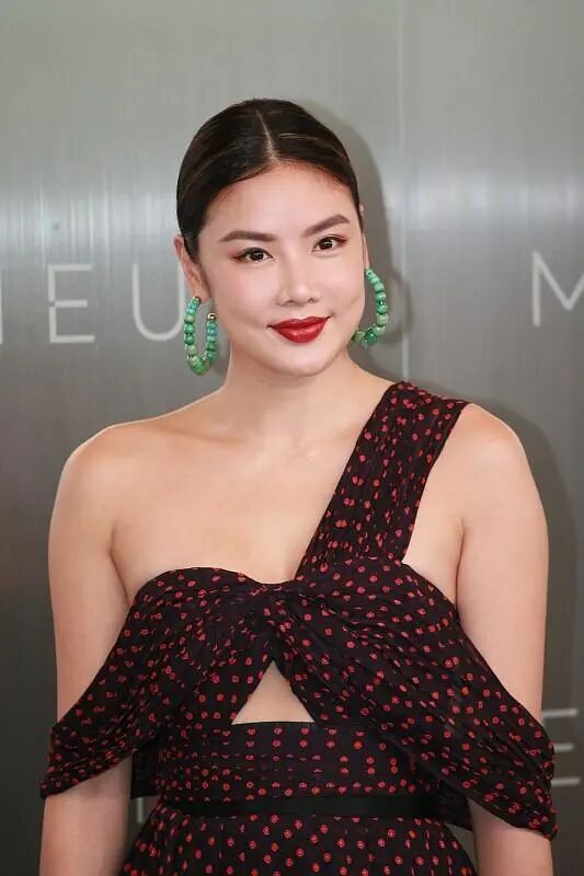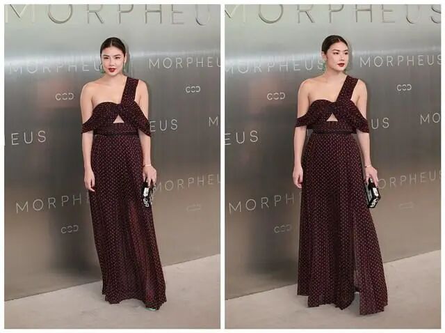 正紅色的裙裝能很好的提亮膚色,增加人的氣色,同時有著很強的吸睛效果。裙裝採用低胸抹胸設計很是大膽,露出性感的事業線,和大半部分胸部,看起來有著走光的風險,讓人忍不住為之捏把汗。