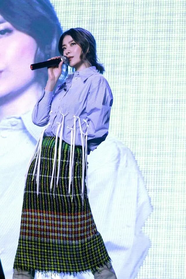 條紋元素的包容性相當不錯,陳慧琳一件藍色條紋衫顯瘦又減齡,淺藍色清新淡雅,顯得她的膚色格外白皙,立領的設計讓她多了一份端莊感,衣服上裝飾的白色流蘇線條讓整件衣服更具設計感,讓她看上去活力滿滿,下身搭配一條經典的千格鳥半身裙簡約大氣,裙襬的毛邊設計讓她多了一份俏皮可愛。