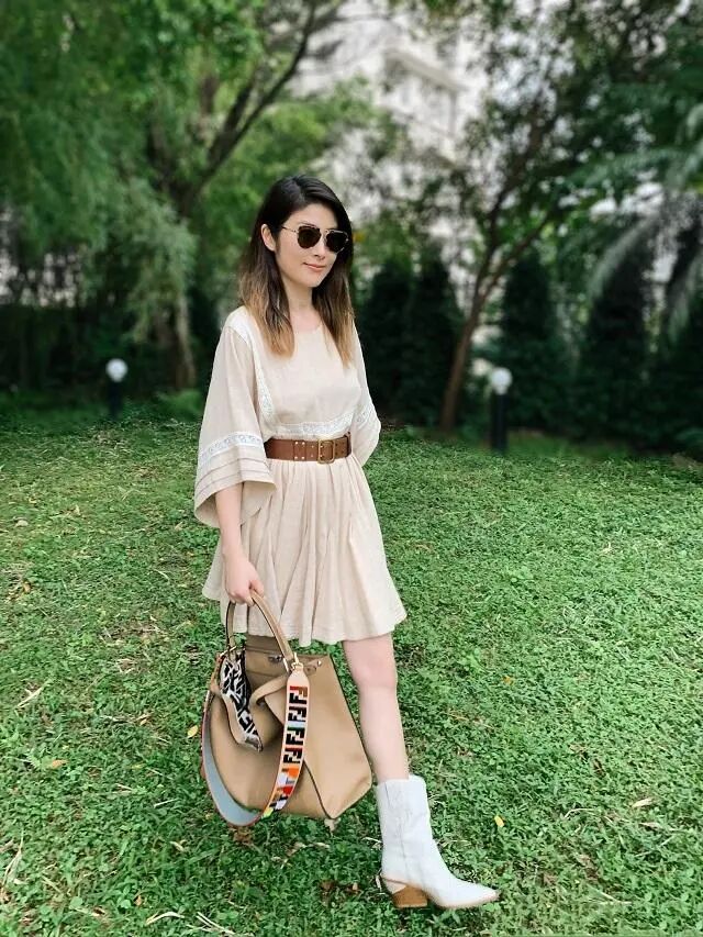 寬鬆的七分袖設計對手臂起到很好的修飾作用,腰帶的設計讓她呈現出完美的三七分身穿比例,裙身點綴的白色蕾絲紋路也是襯得她格外精緻。