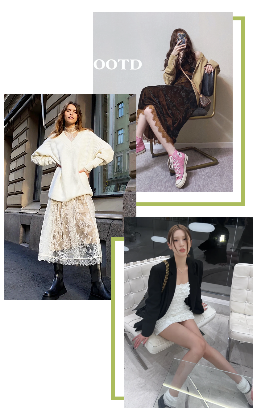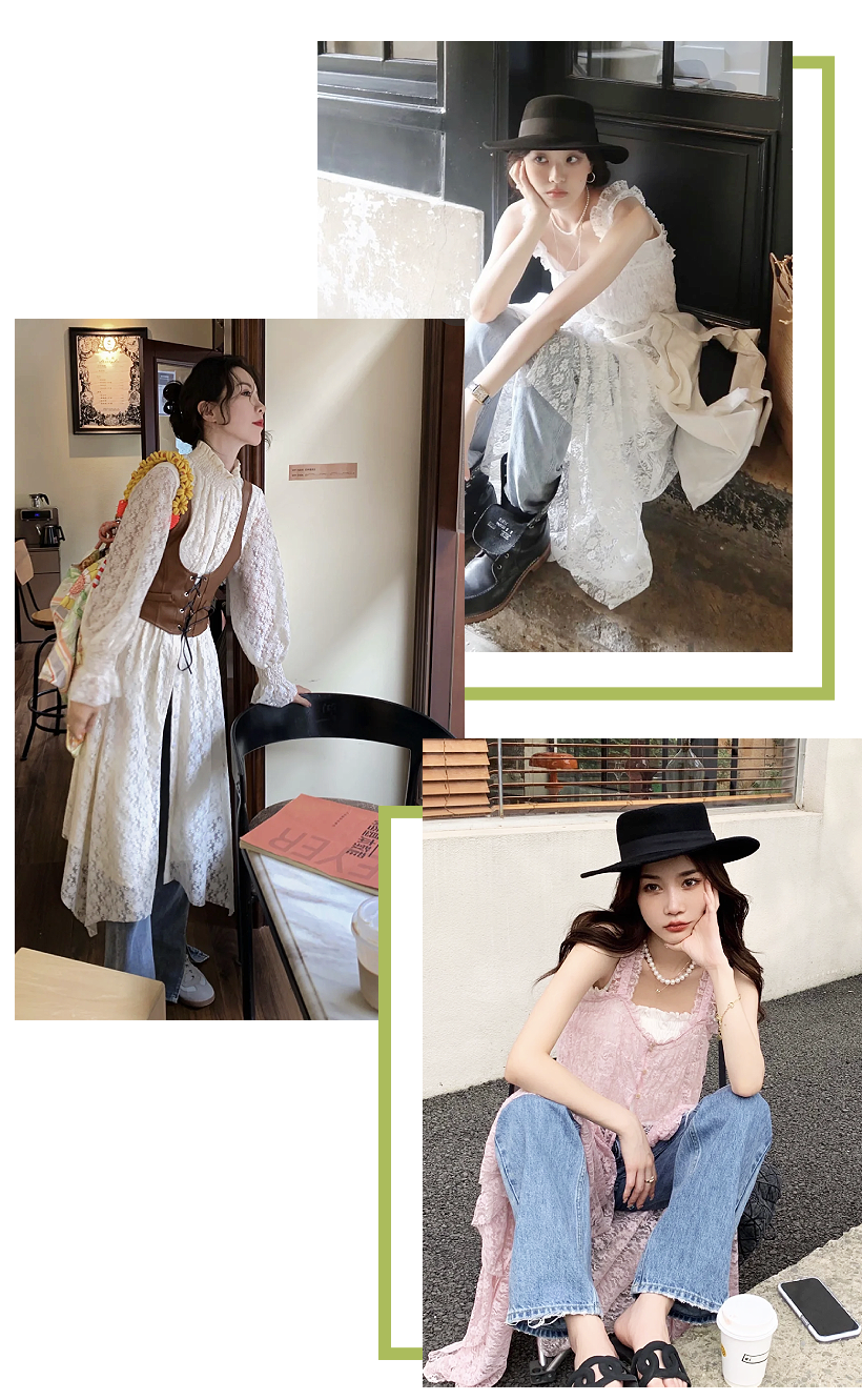 不要穿一整身的蕾絲,可以用西裝、針織 or 單寧……去打破視覺的疲憊感,層次感提升之後看起來就會時髦。