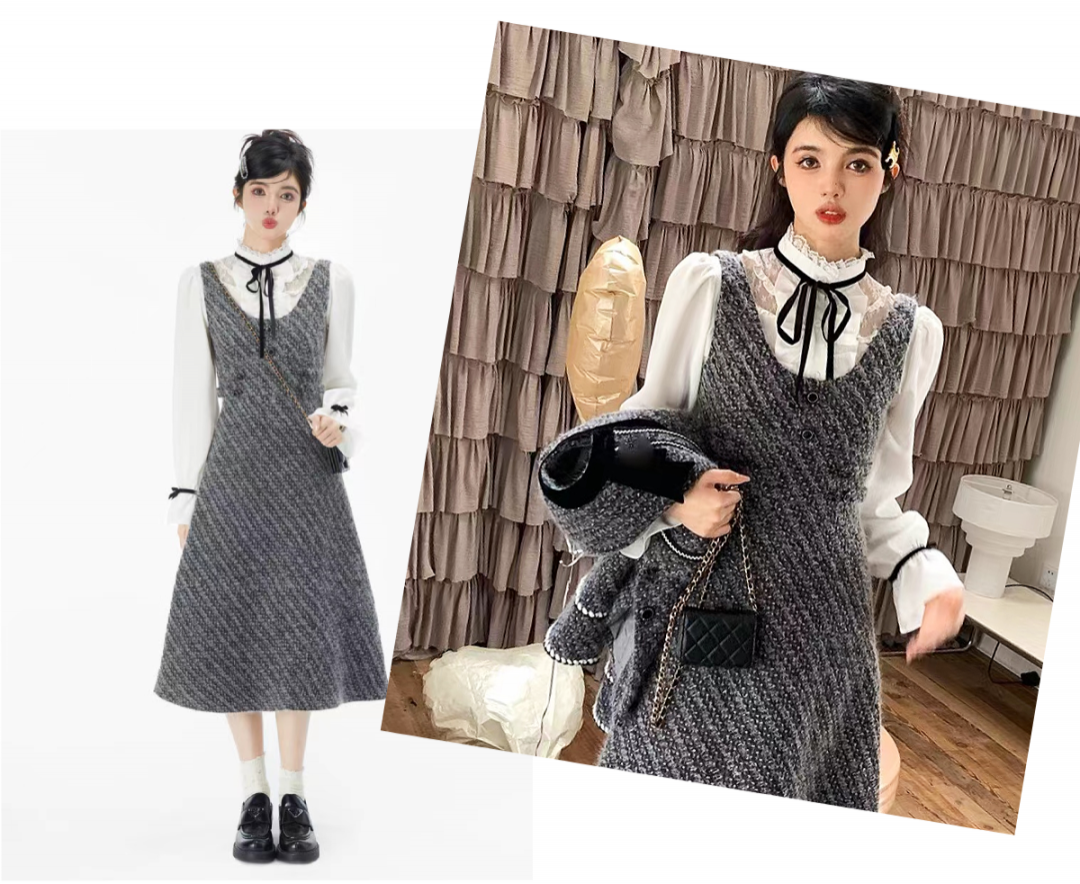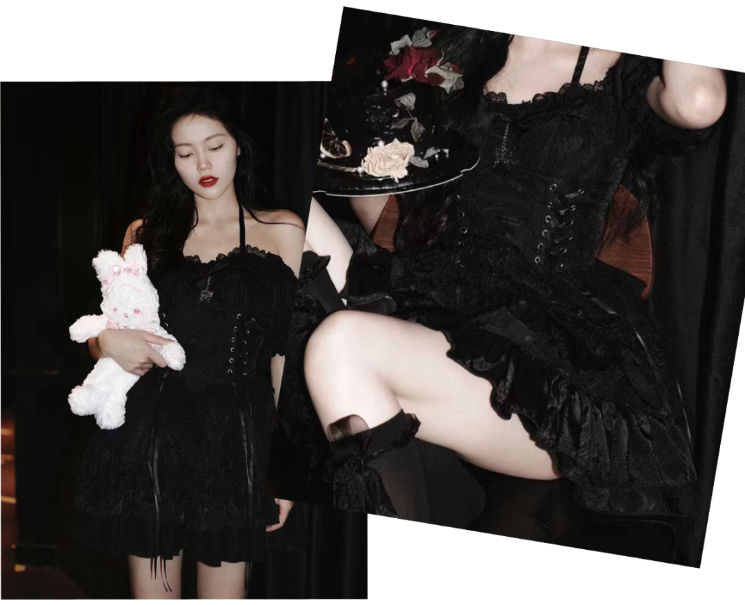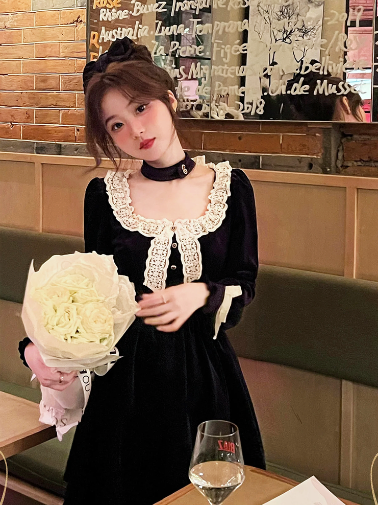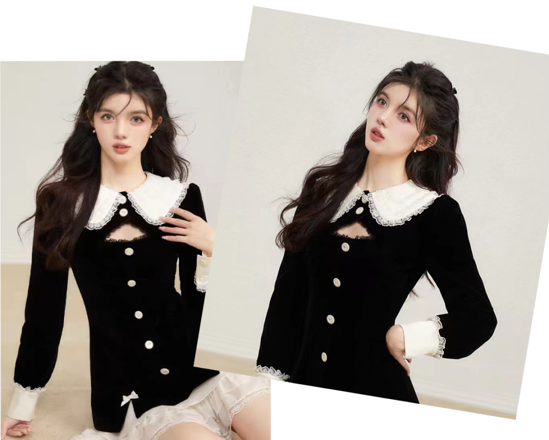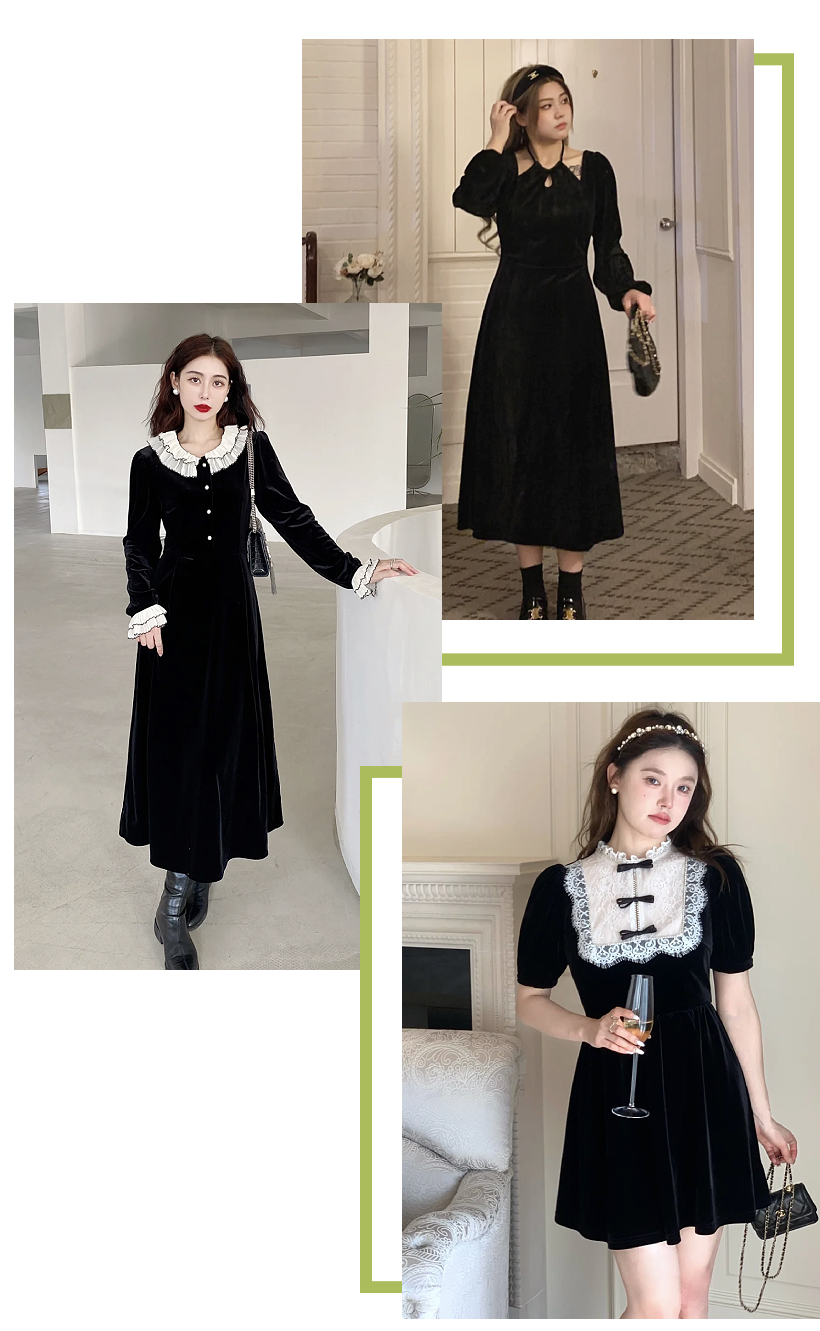 miu味十足的絲絨裙肯定是少不了,白蕾絲&黑絲絨這組cp,穿上身真的就很有千金小公主的感覺。