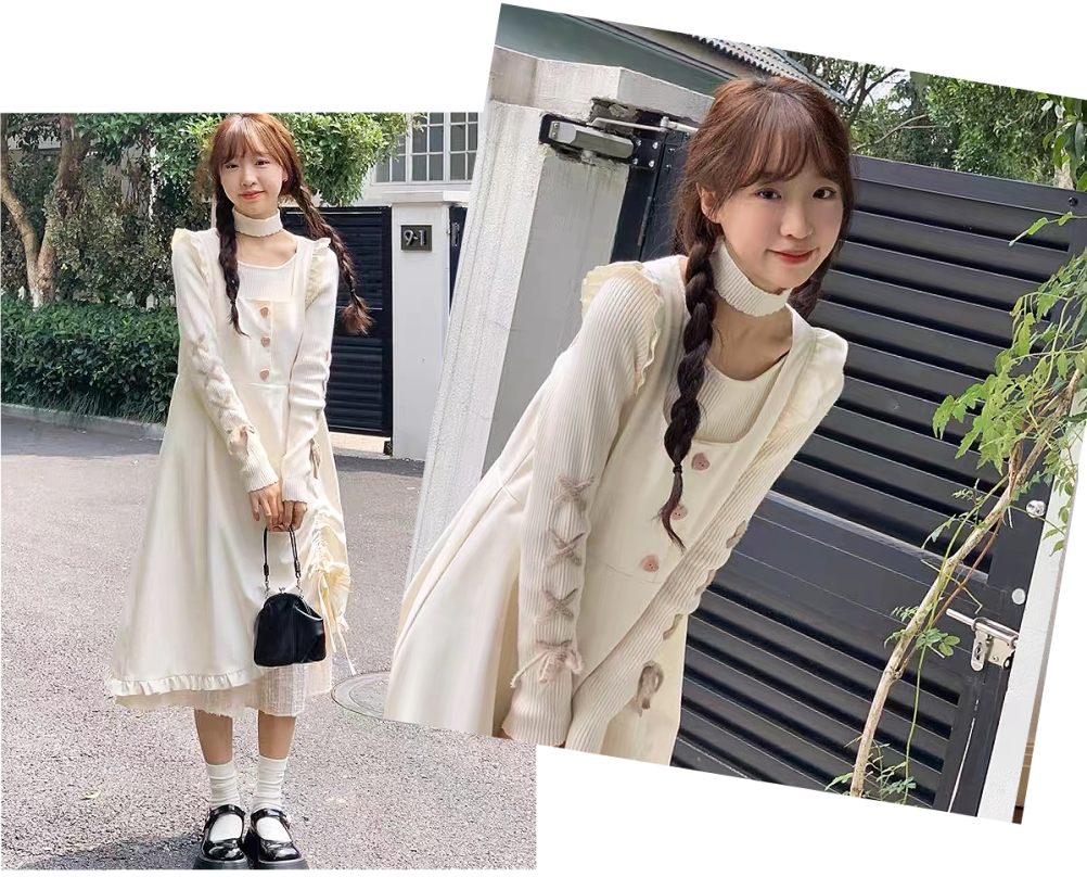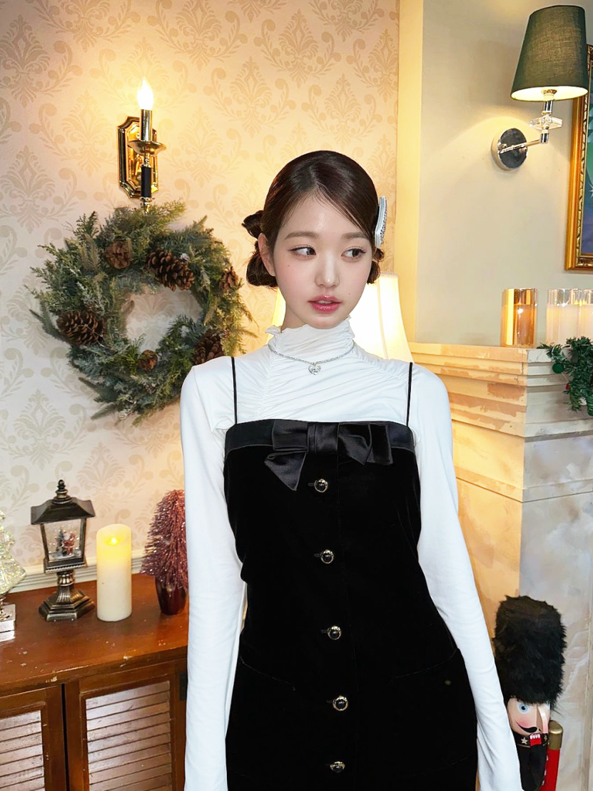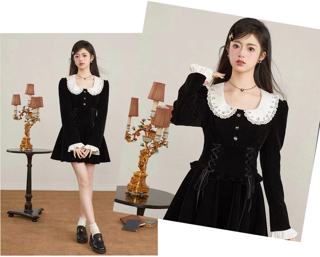 或者是大方的娃娃領的黑絲絨,看起來就很少女心。加上前片的交叉絲帶,甜度直接爆表。