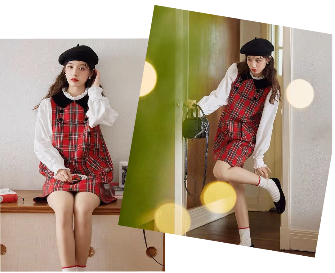 紅色的格紋背心裙,真的是沒辦法抗拒啊~搭配上貝雷帽立刻就有種復古洋娃娃的既視感。