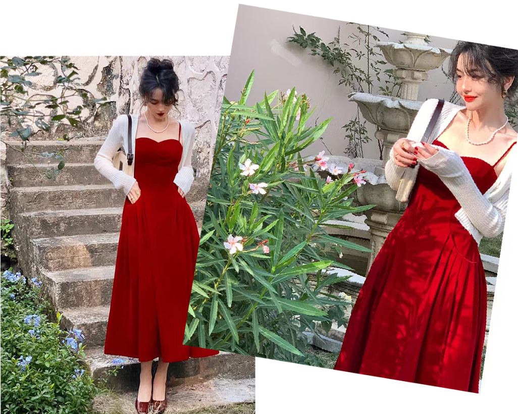 紅絲絨吊帶穿上真的很抬氣色,賊顯白。春天可以搭配小針織,夏天直接穿也很舒服。