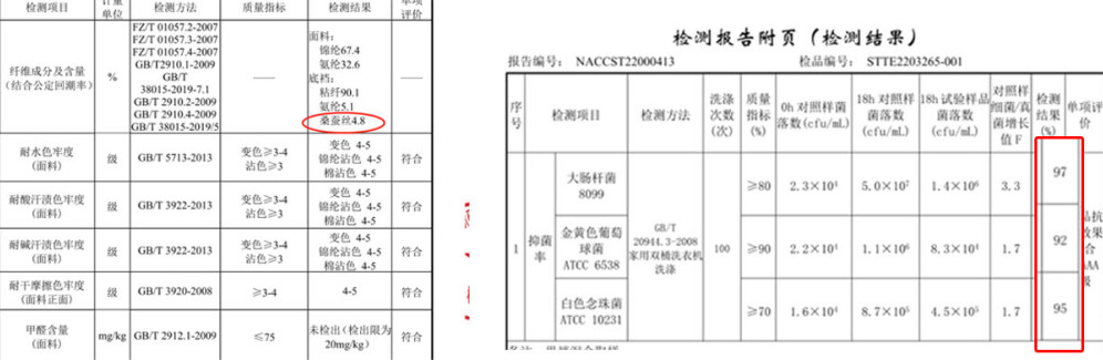 有實在的桑蠶絲含量檢測報告、擊菌率檢測報告(高達97%的擊菌率)