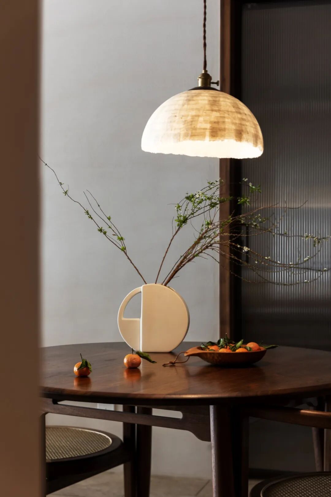 因為餐廳在全屋左右兩側的動線中處於中心位置,所以設計師專門定製了圓桌,這樣既滿足動線的環行,也能在就餐時做到無邊界感,照應每一個人。