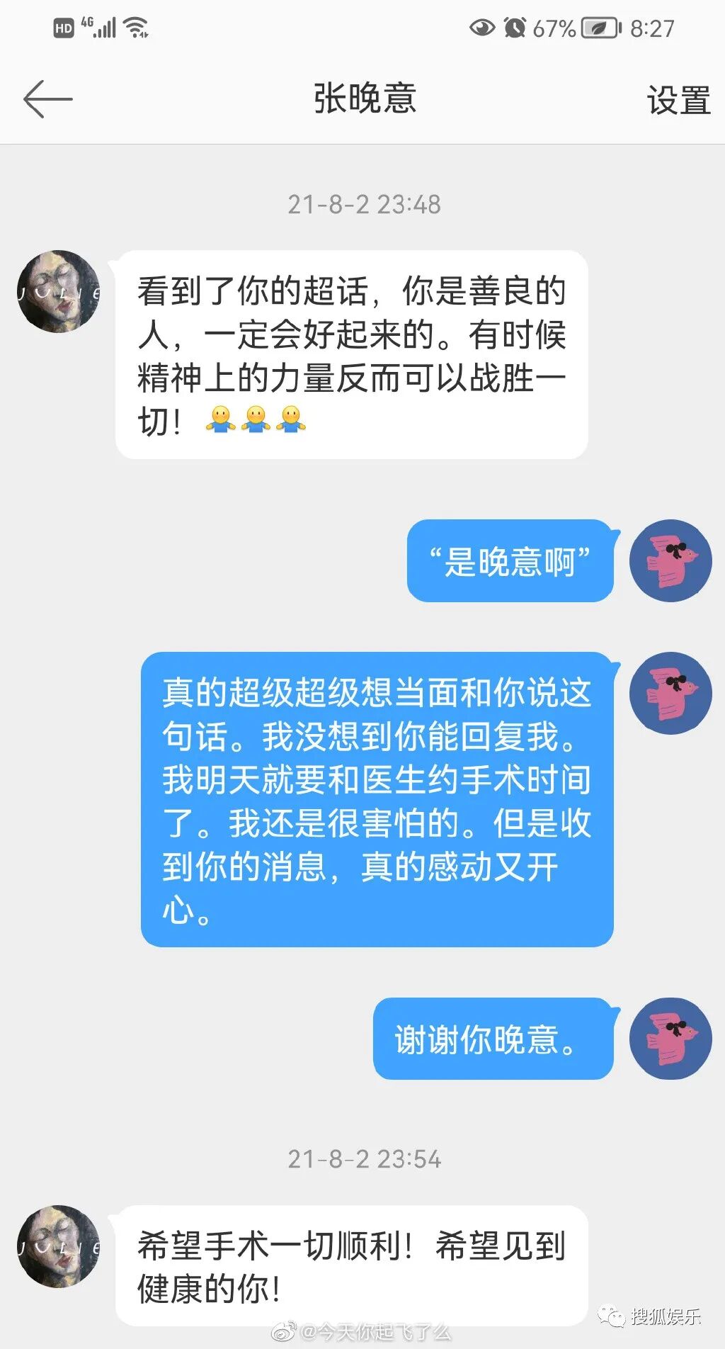 近日,有粉絲分享了幾段與張晚意的聊天截圖,從截圖中看,2021年張晚意曾關心過一名粉絲的病情,並鼓勵她要樂觀、要堅強,精神上的力量可以戰勝病魔。