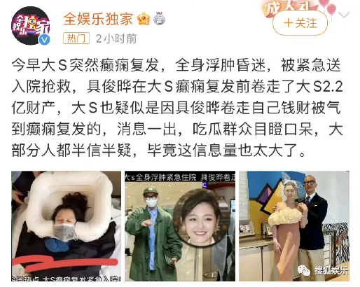 昨晚,認證為“全娛樂獨家”的藍V媒體發文爆料:大S癲癇復發了?!
