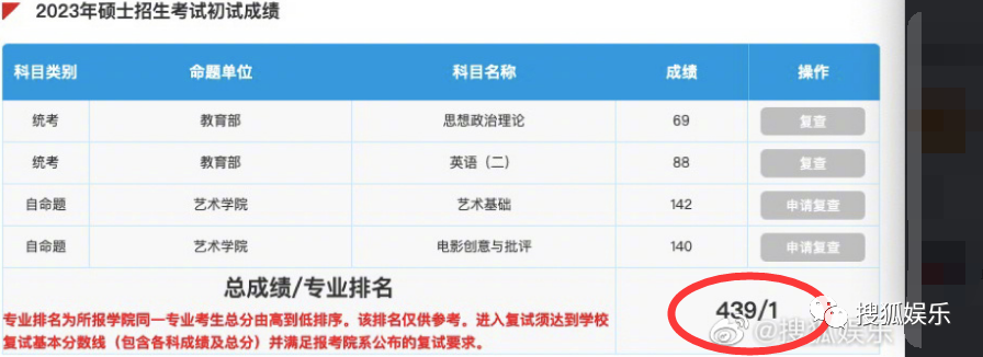 演員紀向寧考研成績總分439分