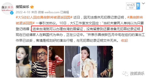 去年4月有傳聞稱,因無法提供無犯罪證明,具俊曄將被遣返回國,當時大S工作室解釋:不知道辦理臺灣居留證要提供無犯罪證明,已經請家人在韓國代為申辦。現在看來,當時大S方說法屬實。