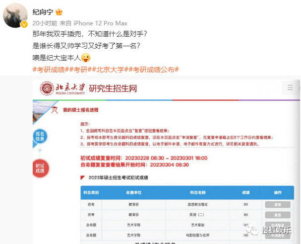 演員紀向寧今天公開了自己的考研成績,總分439分,為北大藝術系初試第一名,好牛!