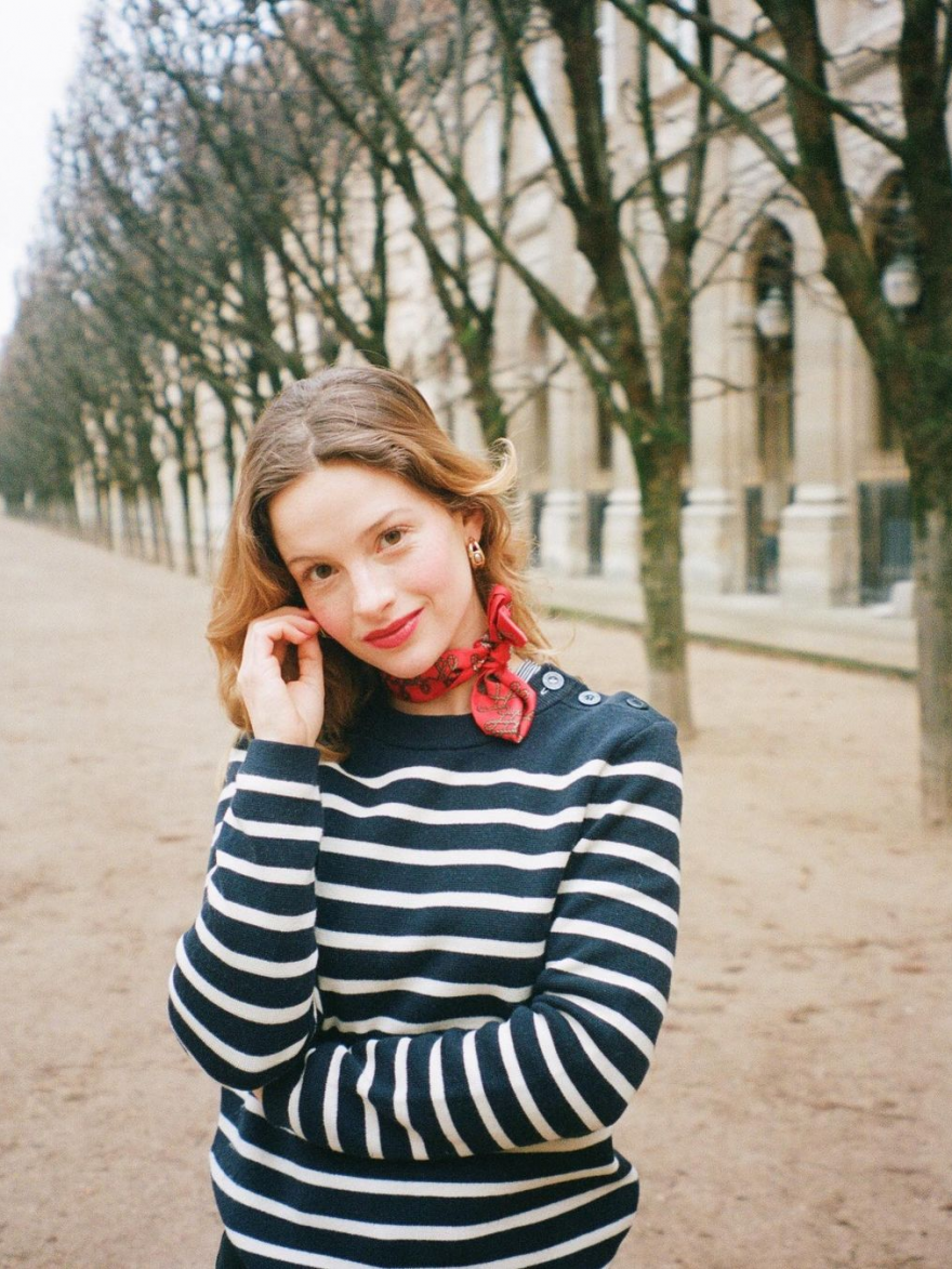經典不敗的條紋衫一直是法式穿搭的Must-have Item款式,搭配上同款髮帶讓整體造型更加時髦完整▼