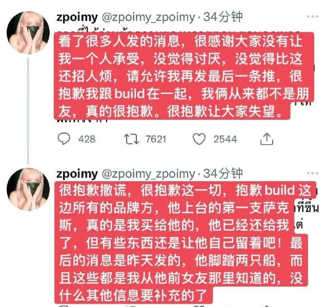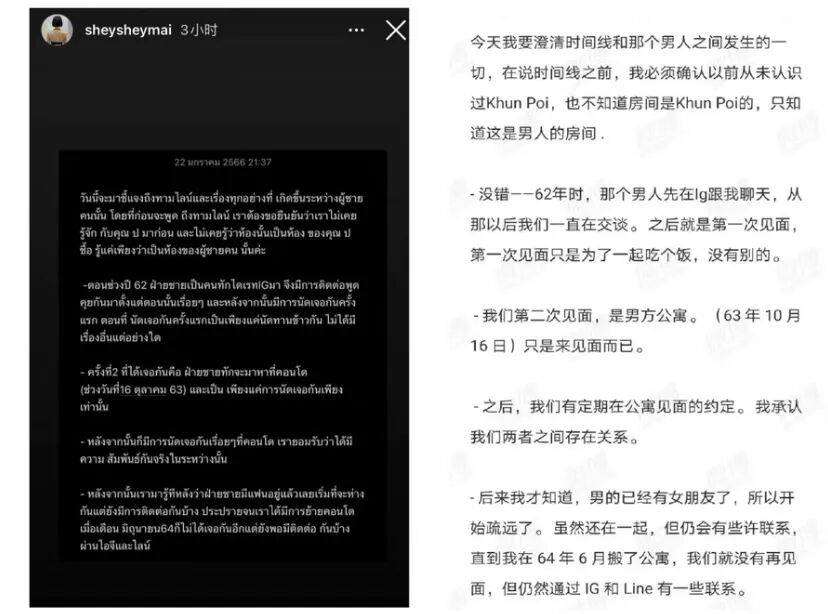 他被發現腳踏兩隻船,還曾在與女作者一起住的公寓裡和其他女網紅髮生關係,女網紅髮表聲明承認了這件事(圖中時間均為泰歷時間),