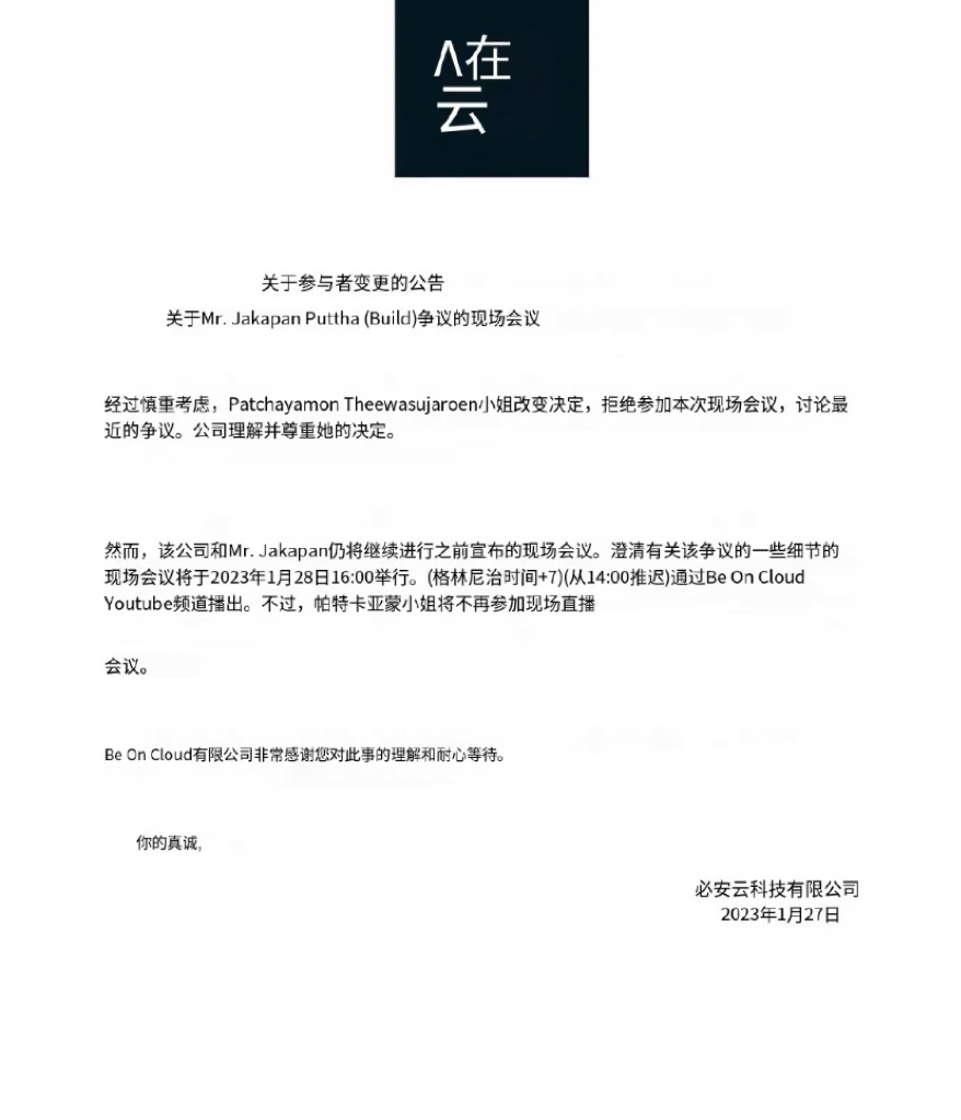 由於輿論過大,Build所屬公司BOC(Be On Cloud)決定在1月28日讓女作者和Build兩人共同開直播回應,但女作者最後表示不會出席,並將走法律程序↓