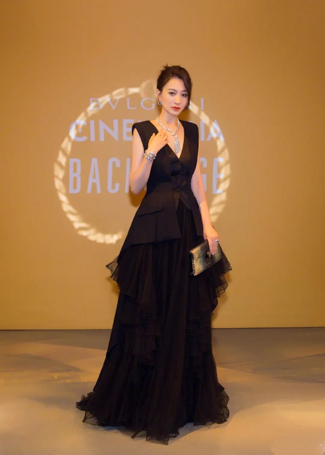 黑色的裙子最是凸顯高級感,無論是長款禮裙還是短款的禮裙選擇黑色都能讓你看起來更加的高端,像李小冉這樣選擇收腰的設計來進行搭配可以凸顯出她玲瓏纖細的腰身,而且層層疊疊的紗質面料更是打造出了一些層次,使她看上去更加的高挑而富有高級氣息,看上去很是大方得體。