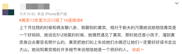 有人說自己住院時偶遇的病友,512地震的時候曾遇到過黃奕,面對粉絲追上來要簽名,她不僅把她們叫上車分了水喝,還讓她們一定要好好讀書走出大山。