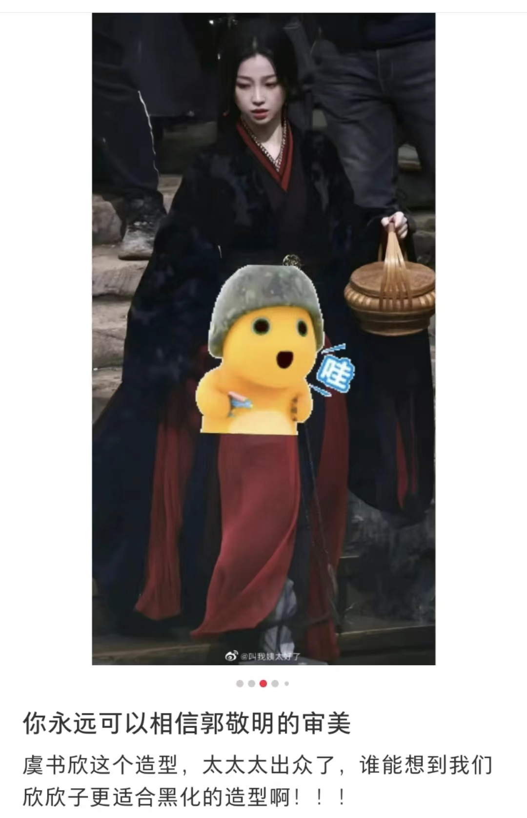就拿“古偶劇”來說吧,前面我們也提到過了,虞書欣在郭敬明古偶劇裡的造型,被人評價為“大變活人”,