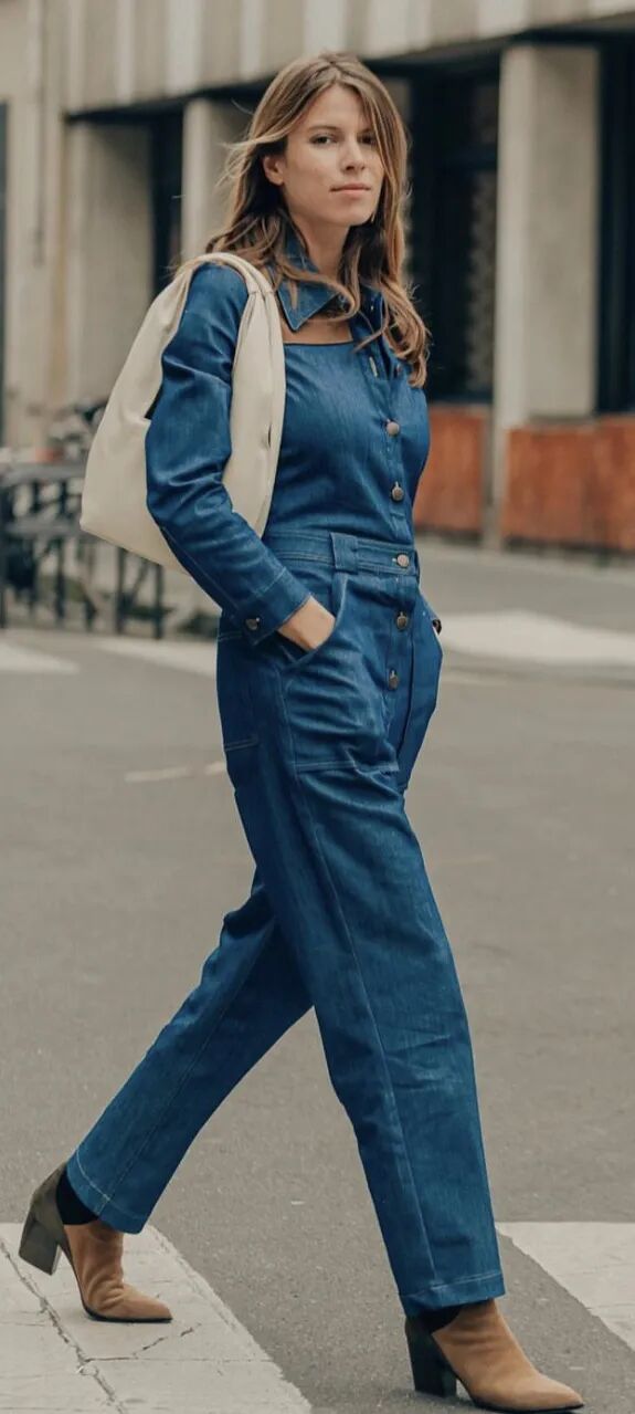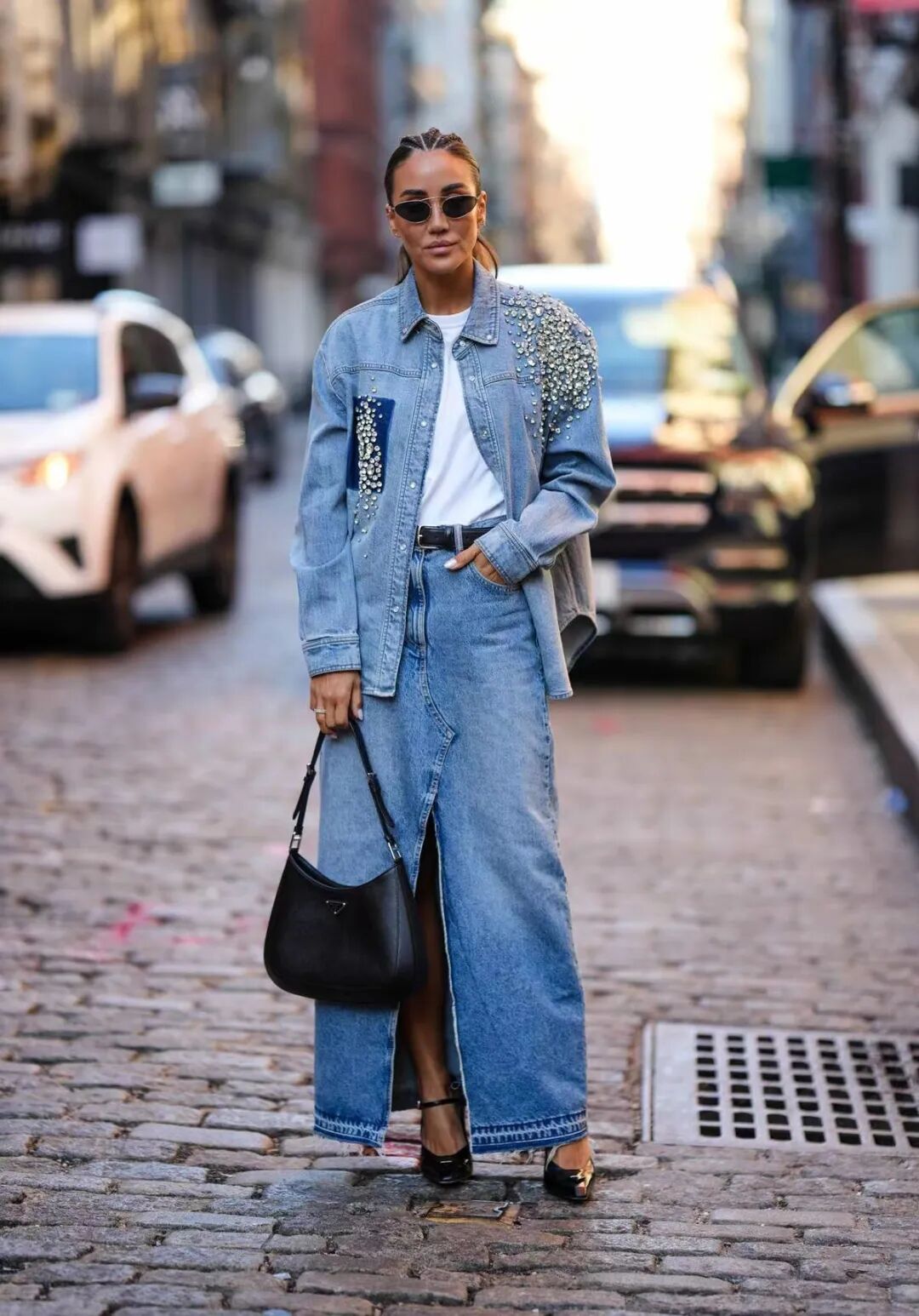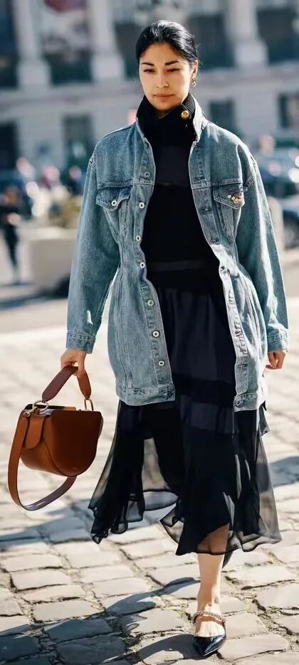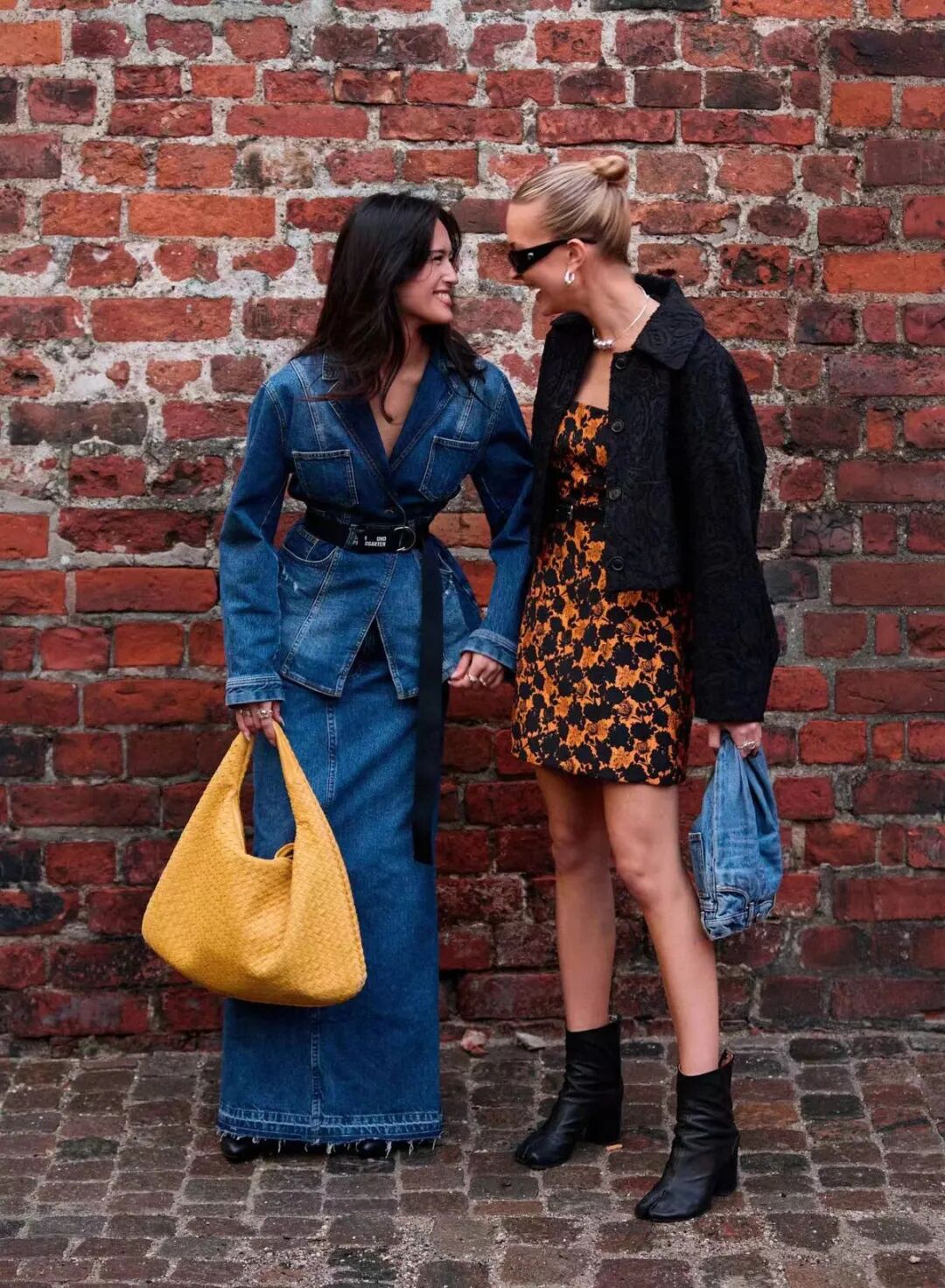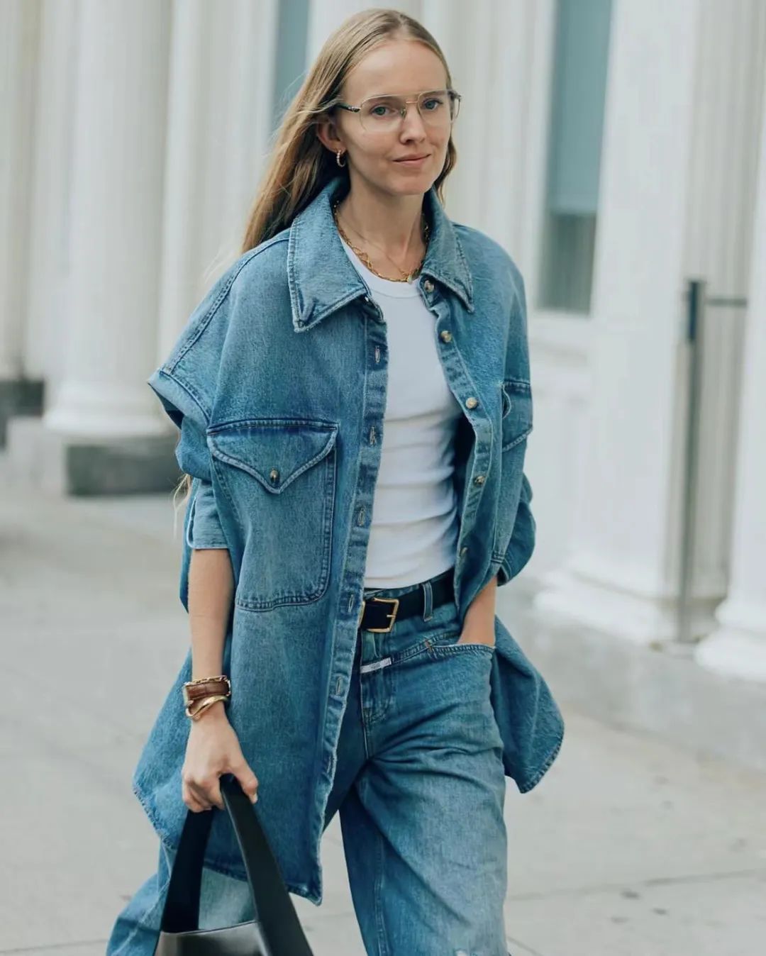 相比搭牛仔褲,配牛仔裙的穿法沒那麼常見。不過在街拍達人的穿搭裡,牛仔襯衫+牛仔裙也變得挺時髦。