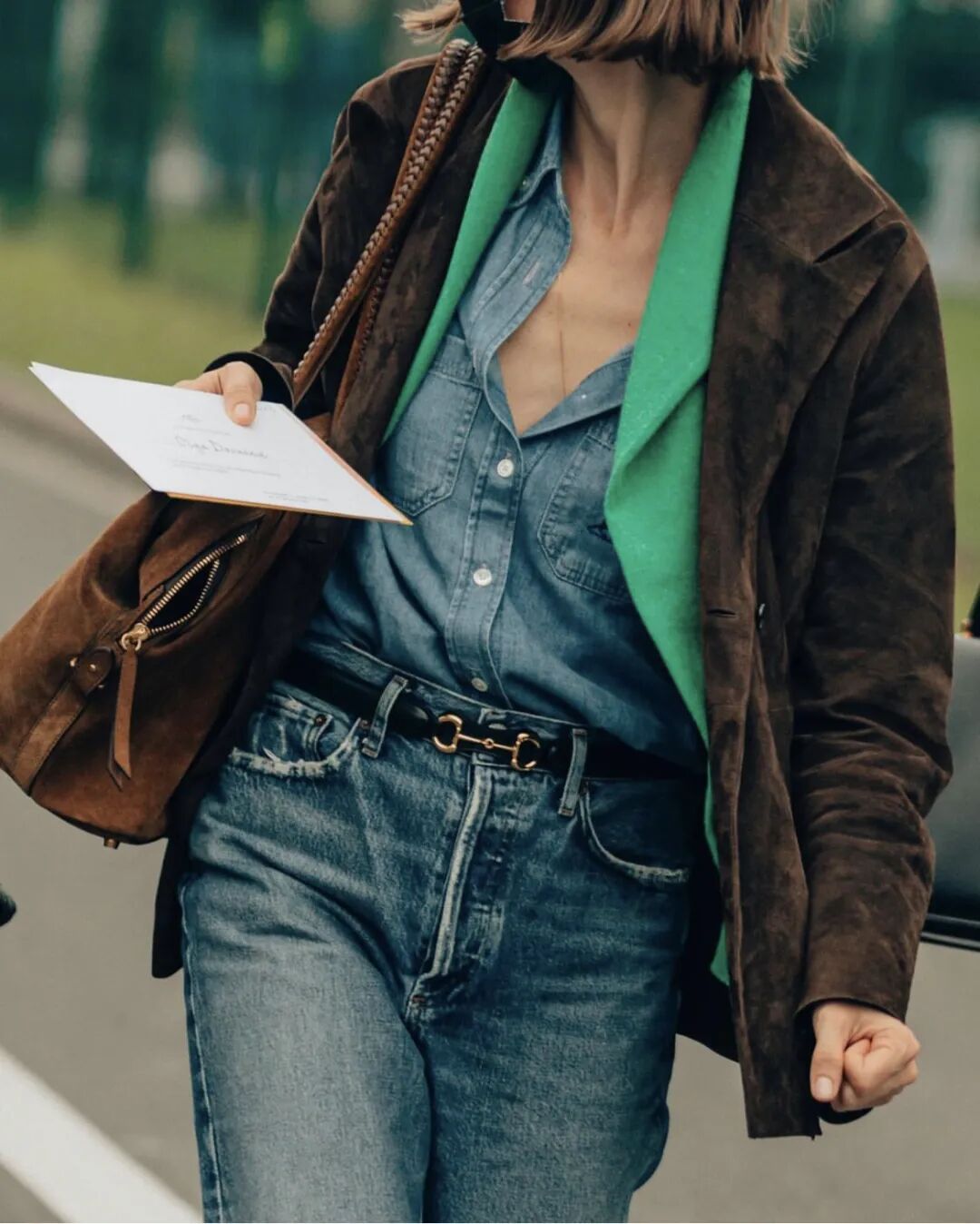 棕色腰帶的細節是關鍵,一是明確腰線,二是打破了大面積的丹寧藍,在視覺上增加了亮點。